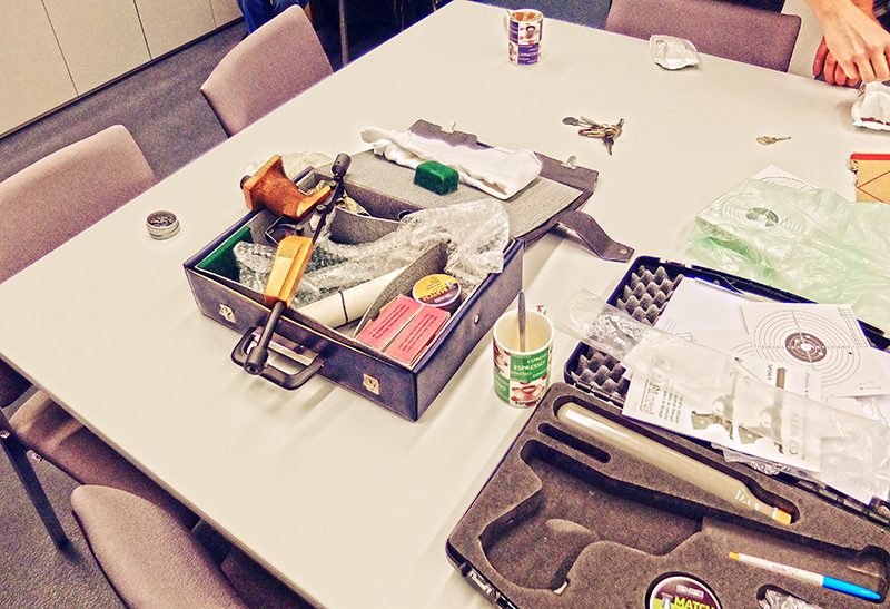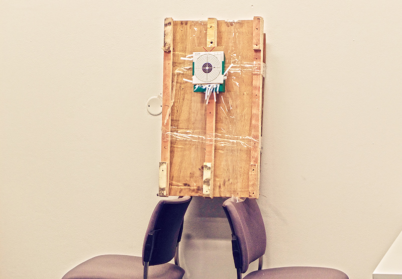 They carried with them two rugged cases that looked like they may contain a Dremel multi-tool or electric drill. We entered the practice room, a long brightly lit office with a table fit for many an animated conference. On the far wall there was a large white board, which two of the guys promptly removed. On the wall by the door was a wall to wall glass cabinet containing numerous books and papers. My girlfriend had previously remarked that on her first attempt days before, she had missed the target and shot the wall. And sure enough when the whiteboard was removed, there were two rather conspicuous dents in the wall.
