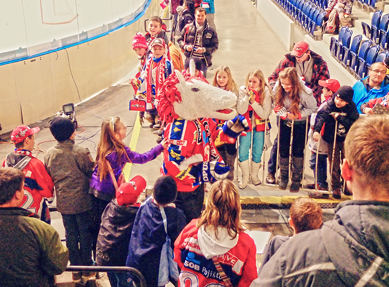 The timer on the scoreboard ran down to a few minutes remaining, children gathered by the railings in front of us, drowning in their oversized hockey jerseys. The players appeared to a huge cheer from the crowd, the kids eagerly high fiving the players as they ran past, through the horses mouth and onto the ice.
