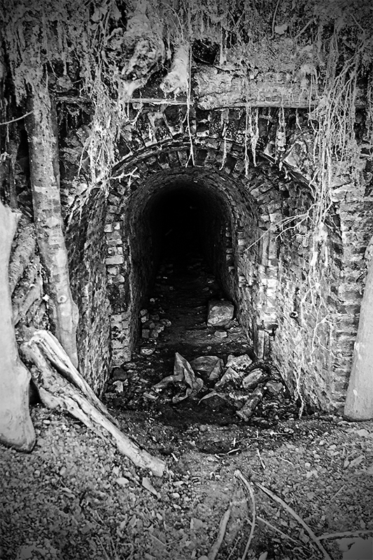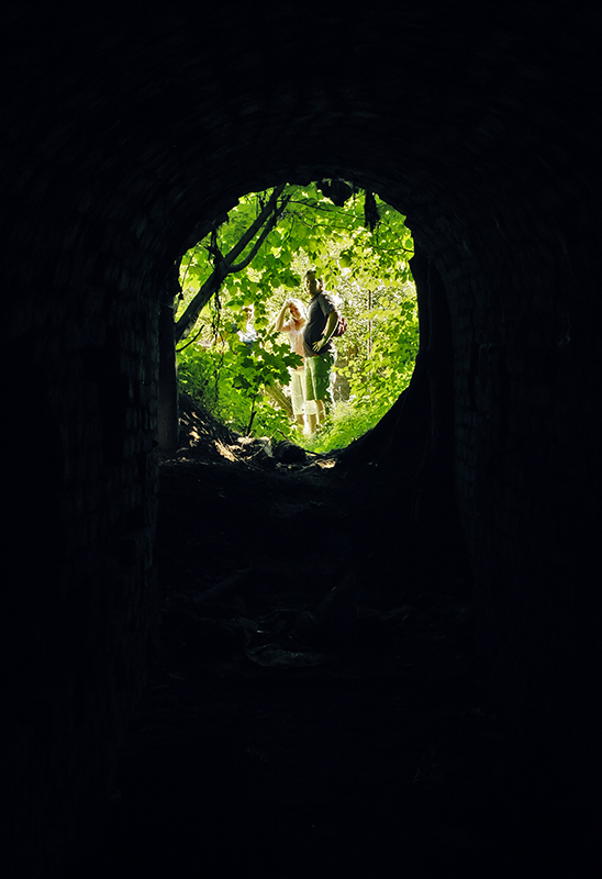 We made our way along a narrow path between these plots and some trees and eventually arrived at the ominous passage entrance. It’s just like something out of a fairy tale, where the goblins live. We proceeded inside and within a few feet we were in complete darkness. I switch on the torch from my phone and we carried onwards. The ground below became damp and uneven, pockets of dust being kicked up into the torchlight on the drier patches.