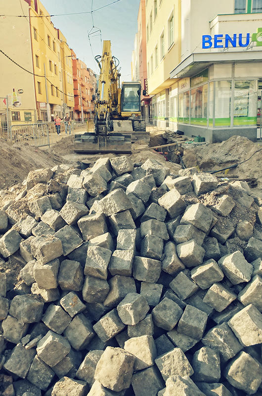 For the past few weeks Trida Miru, the main thoroughfare of Pardubice has been undergoing a bit of a transformation as the local council seeks to refurbish the street and bring it into the 21st century. Every day while walking to work has been an adventure of climbing over rough ground and dodging diggers and excavators as you go. It’s fascinating to see a completely different layout every day as one section is completed, and another hole is dug up next to it.