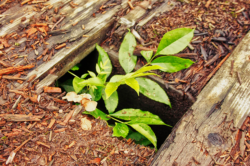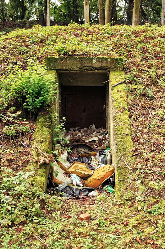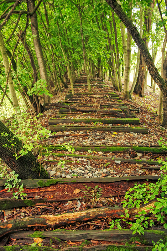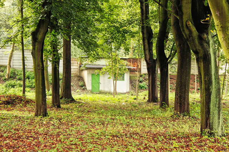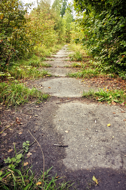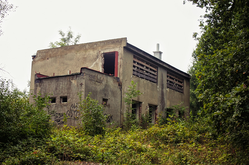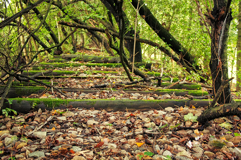 The military facility was the first place I came across in a clearing in the woods. There’s not much to see there really except for some out-buildings, what looks to be some kind of underground structure, a dilapidated volleyball court and oh yeah, an abandoned train line! I noticed it when I first entered the clearing and saw a concrete bridge off to the right that looked fairly run down with vegetation on the top of it. I figured it must be a train line and set about trying to find a way up the steep embankment leading up to the tracks. Nature had definitely taking back its land with entire trees growing up where the cracks once stood, the wooden sleepers covered in moss and lichen, the only evidence left of what once was.