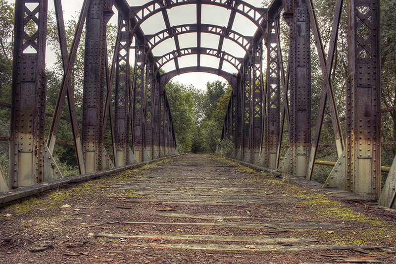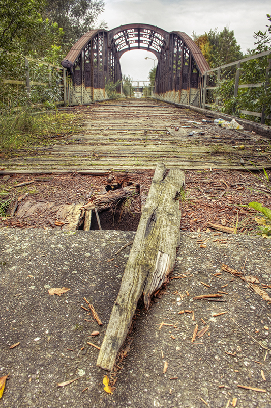 Eventually after slogging through the damp woods I came across the bridge in all its rusty glory. The far end of the bridge was fenced off at the entrance to an industrial/warehouse facility on the other side of the river. Holes littered the wooden surface of the bridge and I was a little skeptical walking out on it but it’s still fairly sturdy.