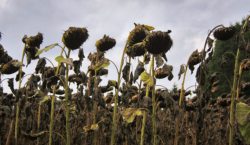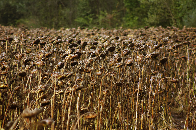There wasn’t too much to see along the pathway other than field after field of dead sunflowers, still several feet high but their once vibrant yellow flowers bowing down, turned brown and looking anything but sunny. In the distance a scrambler was interrupting the peace and quiet on a dirt track next to my intended location.