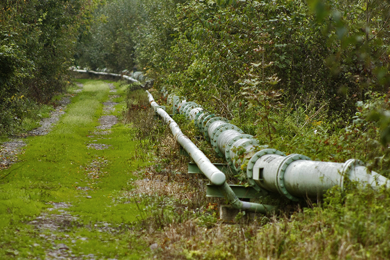 Thankfully I wasn’t discovered and was able to continue on to the most interesting part of the tailings pond, a rusty walkway that goes out into the middle of the half empty pond. The pipe turned towards the pond at several parts and you could see that material had come out in the past by the stained holes in the ground from the pressure of liquid hitting the stones and mud.