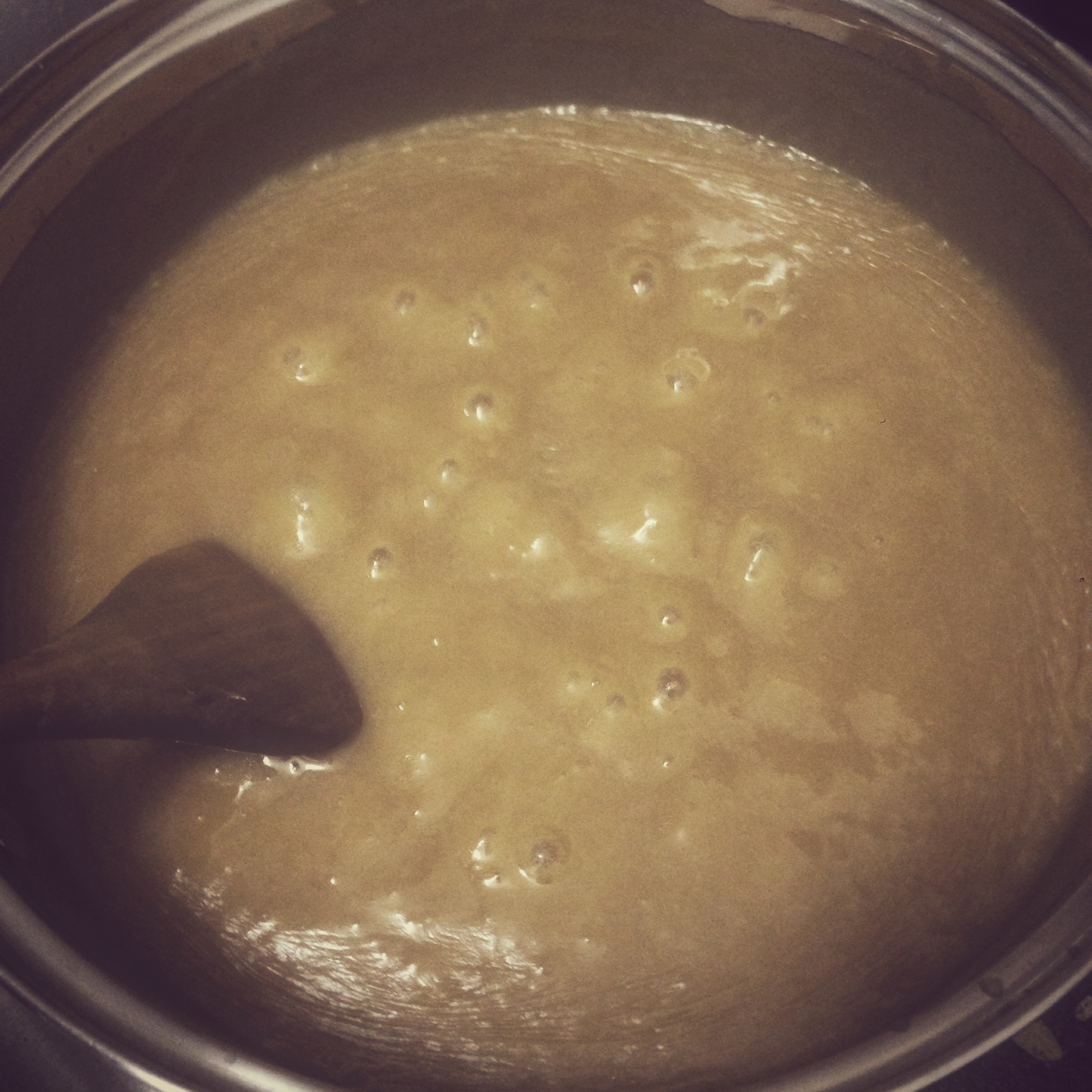 Roysh while that’s crisping up nicely you can press on with the fun bit, making the caramel. Fetch a saucepan, doesn’t need to be a huge one, let’s go with medium. Place your butter, sugar, golden syrup ( or honey) and condensed milk (not evaporated) all into the saucepan together and bring up that temperature. Give it a good and constant stir until the sugar has melted, being careful not to put the heat up too high or the sugar will start to congeal and your mixture will get these chunky brown crystals floating in it….which aren’t ideal but can easily be stirred away once you drop that temperate down a bit more.