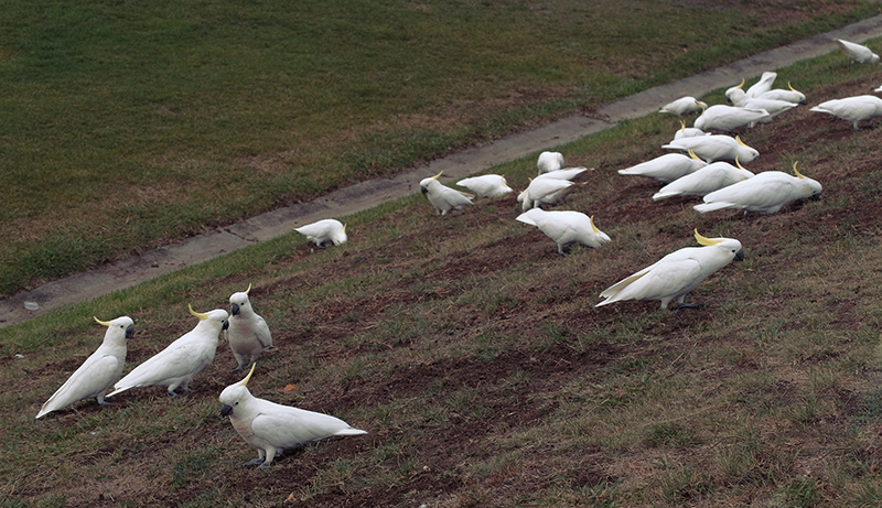 Basically, there are flocks of cockatoos hanging around the waterfront near the university and they’re just there….like pigeons back home except they’re these beautiful exotic creatures with…….the most horrendous and unromantic screeching call you can imagine. No musical melancholic notes with these guys, oh no. They strike me as the jerks of the local bird world, like a gang of unruly teenagers hanging outside the corner shop and harassing little old ladies.