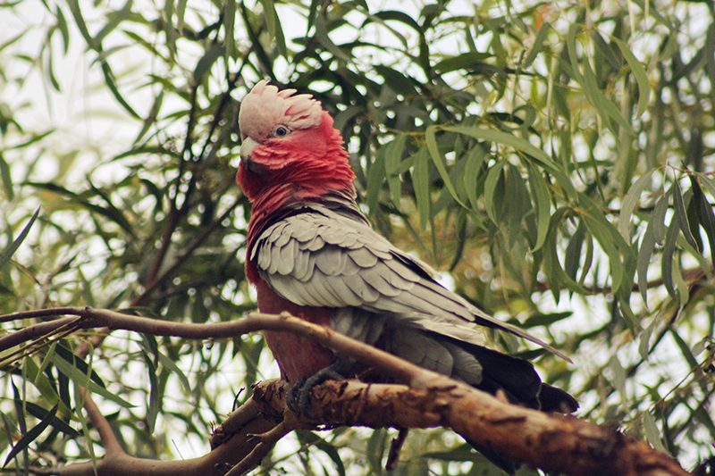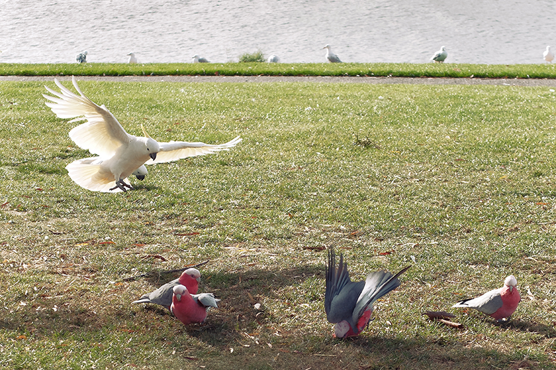 The other cockatoos are the Galahs or Rose-Breasted Cockatoos and they are far more pleasant and arguably easier on the eye too with their…..well the clues in the name…rose coloured chests and little white crests which they puff out occasionally. They seem to get a bit of a hard time from their bigger cousins, possibly demanding protection money or something similar.