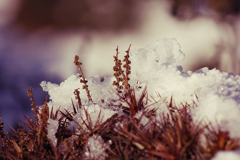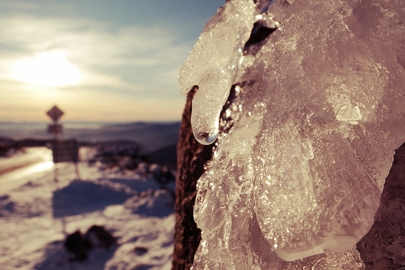 The drive up to the summit revealed the extent of it however as car after car drove past us, snow piled atop their bonnets or falling off with each bump in the road. As we drove higher and higher the air grew thinner, colder and the light started taking on that magical mountain glow. Glimpses of the summit between the trees revealed a rather heavy presence of snow, glimpses which became more frequent as we approached the top. The gum trees began to give way to hardier species adapted for colder climes, thick gorse like vegetation became the norm and then almost instantly there was snow at the sides of the road and trapped in the leaves and branches of the vegetation. The snow grew thicker and the road surface turned to ice in the little corners untouched by the wheels of cars.