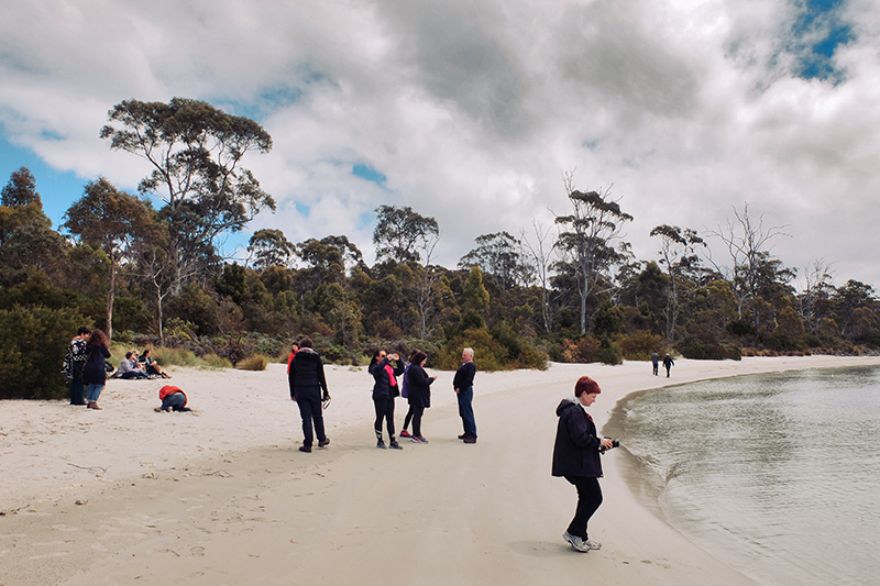 From here it was a short drive on our comfortable Love Tasmania Tours coach to the Ida Bay Railway, the last operating bush “tramway” in Tasmania. We picked up our packed lunches from the cafe and awaited our noble steed. The base of operations at Lune River is a hodgepodge of sheds and shacks from the heyday of this historical gem. The bright red WWII era locomotive soon appeared around the bend and it was all aboard on Australia’s most southern railway. There was a brief wait at the crossing before we ventured into the bus towards Deep Hole and Elliot’s Beach. On the way we passed through beautiful scenery of button grass plains, white sandy beaches and the banks of Ida Bay and Lune River Estuary.