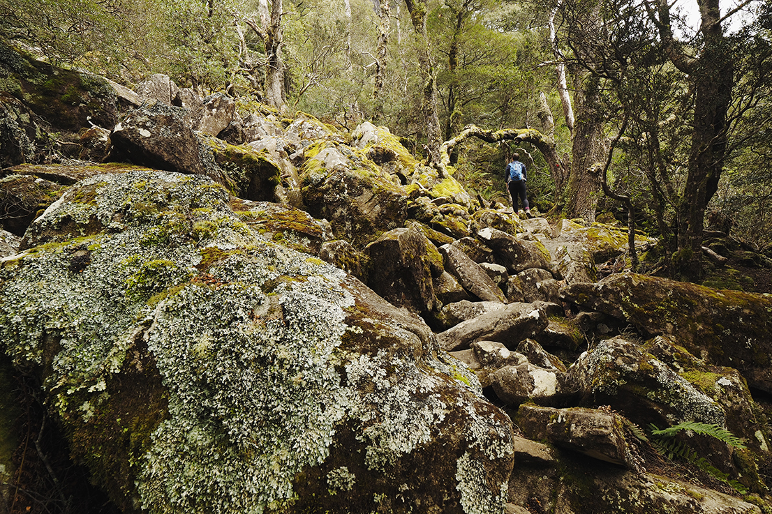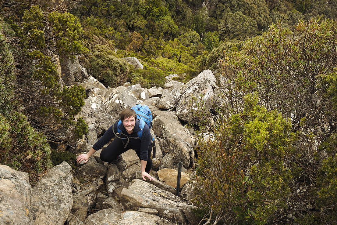 Before long the forest cleared and gave way to an open scree slope. It wasn’t a patch on the huge one at Stacks Bluff but still a nice hop, skip and jump all the same. We stopped to catch our breath and slug some water before continuing back into the woods towards the summit. There’s a cool saddle just below the summit that offers lovely views through to the valley behind Quamby as well as back the way you came. You then turn to the right and make your way up a short rock scramble and before you know it, you’re there. The vertical gives way to horizontal and your legs can relax a bit. You’re almost there.