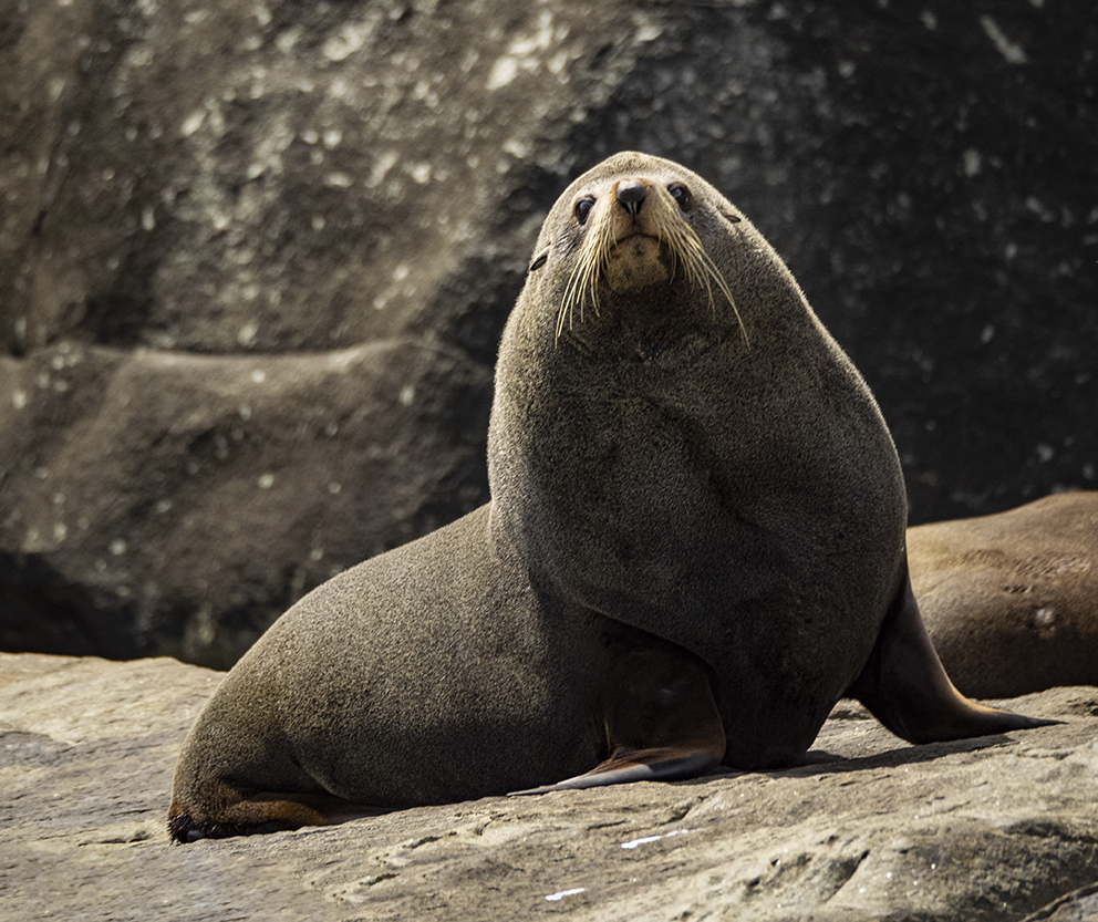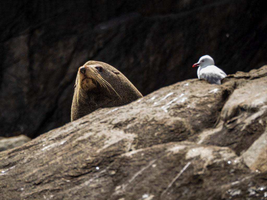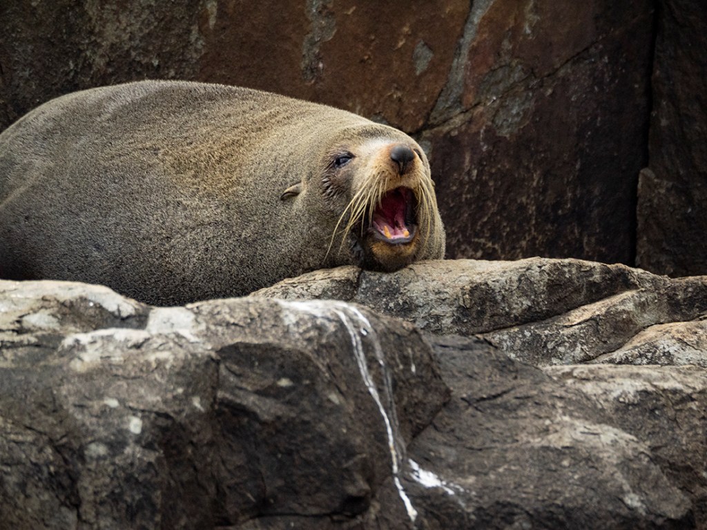Any trip on the waters around Eastern Tasmania this time of year promises the chance of spotting those most glorious of creatures, Whales. Alas we were a little late to the party as it’s currently the tail end of the migratory season so we didn’t spot any this time around. That didn’t mean the trip was devoid of wildife, no sir. Cape Hauy is home to a colony of Long-nosed Fur Seals and we were lucky to get a front row seat to their chillout session on the rocks at the base of the massive cliffs.