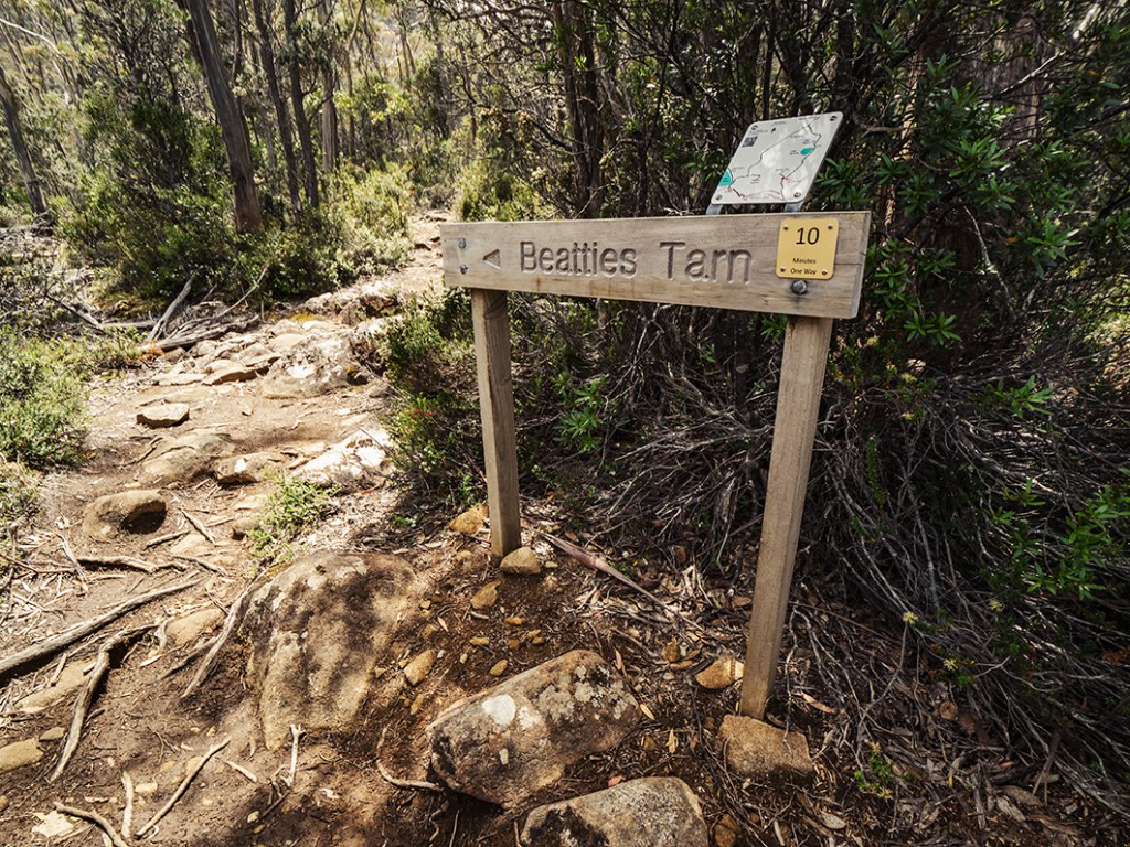 It wasn’t long before we reached the first point of interest on the walk. There were many points of interest before this I think personally but I suppose the guidebooks would call this the first. That being Beatties Tarn, named after John Watt Beattie who undertook numerous photographic expeditions around Tasmania in the late 19th century. It’s a lovely little body of water with crystal clear water and a fine harbinger for its larger cousin further up the mountain.