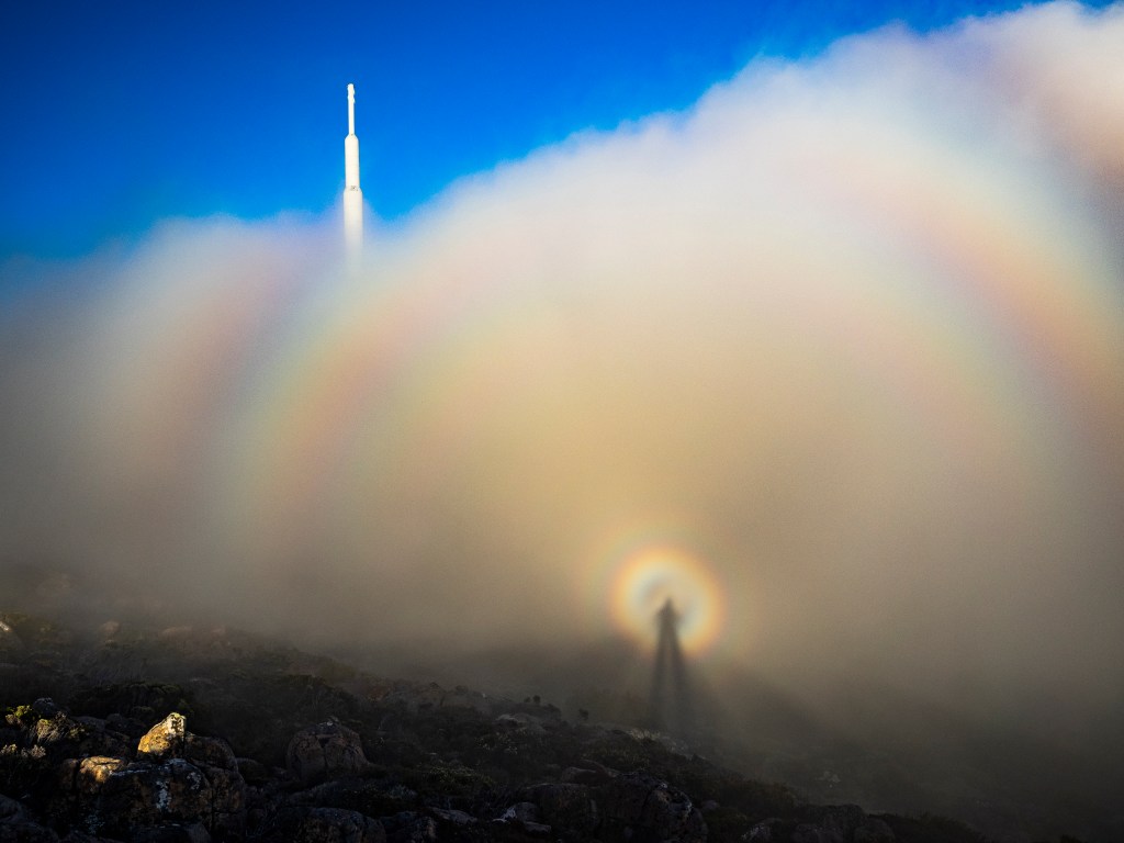As I left the car park and made my way down the South Wellington track, the mist was lopping its way up and over the top of Mount Wellington. Visibility was down to a few feet and the atmosphere was really quite special. I turned back to see if I could see our car and was greeted with something I never expected to see, a Brocken Spectre! It’s a really cool phenomenon whereby your shadow is cast onto clouds opposite the sun’s direction.