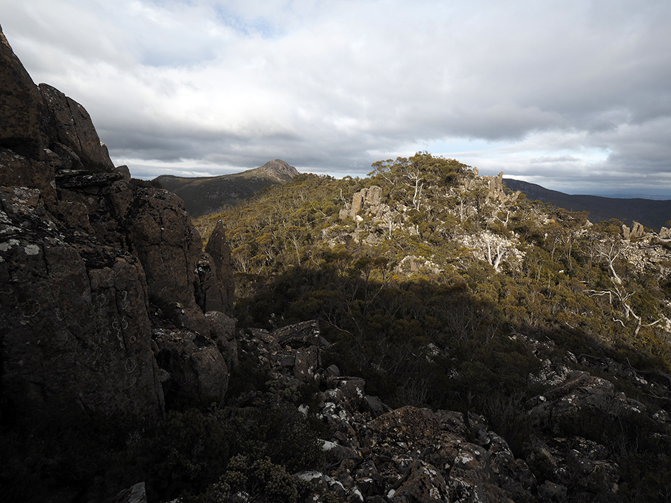 The summit, like many of the peaks in this area seems to just pop up out of nowhere. There’s a short scramble up some large boulders, the temperature drops suddenly, the wind picks up and you’re there. A large rock cairn marks the summit and there’s a couple of spots to sit down and take it all in. The most impressive sight from the summit is Collins Bonnet with its exposed rocky top jutting out above the forests below. You can also catch the edge of the Tasman Bridge making its way over the Derwent river towards Hobart. On a clear day you can see out to the mountains beyond and Tassie’s highest peaks.