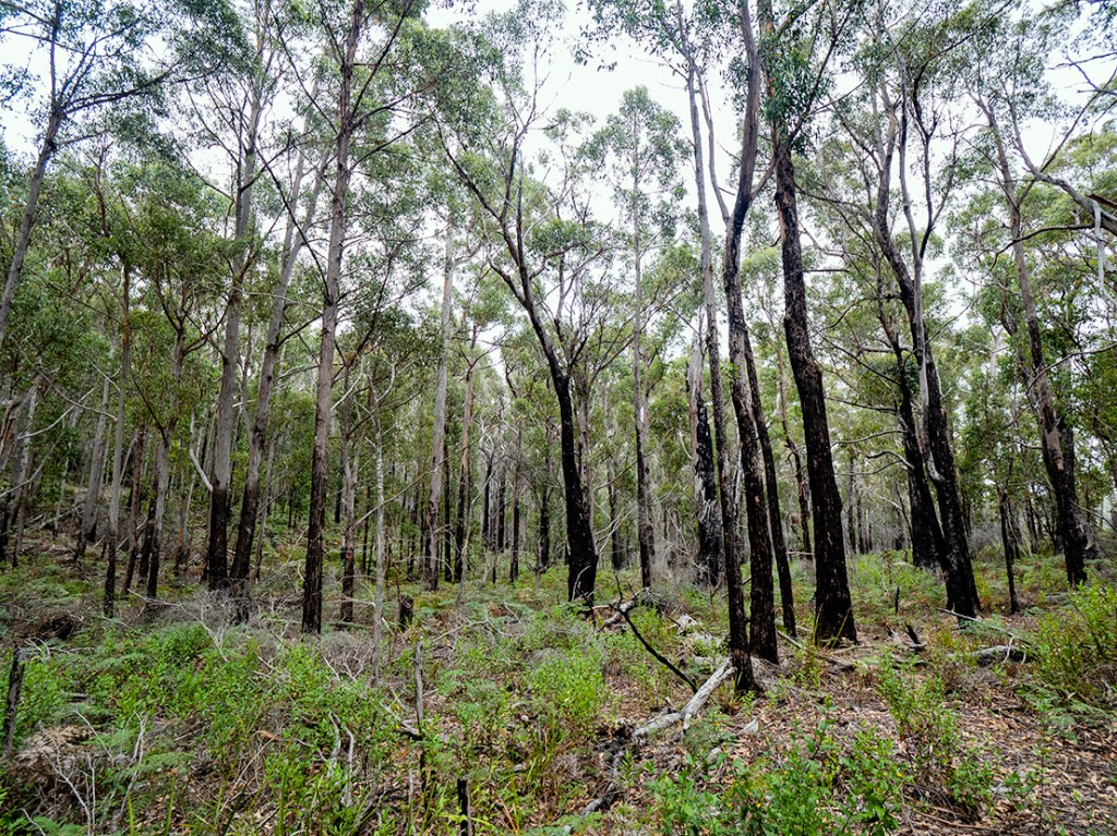 A recent fuel reduction burn still visible with blackened trunks and a distinctively sparse floor