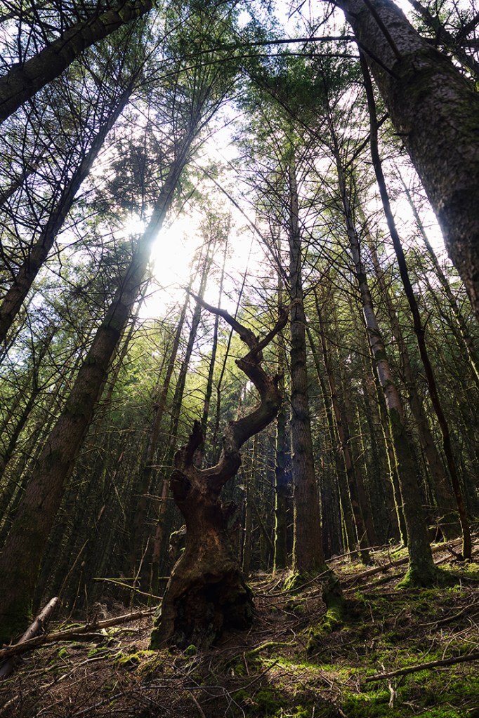 Djouce is located on the Wicklow Way, a 127km trail that takes you through some of Ireland’s most beautiful country and takes a week or so to complete. We were venturing along this route when I noticed a different signpost that seemed to be pointing more or less in the direction of Powerscourt Waterfall, Ireland’s highest and still a fair way below us. A quick look at a GPX trail app on my phone and I could see it led all the way down to the base of the falls. I convinced Alan that it would be a great idea to head that way and so we set off on our little detour. The path led us down and onto a steep hillside densely covered in falling and overgrown plantation forest.